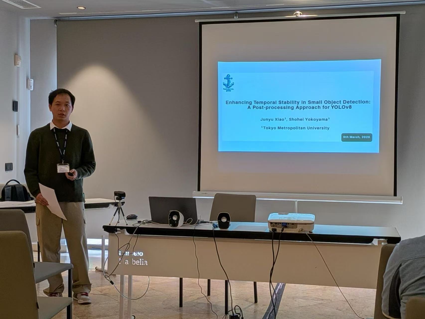 横山研究室所属の肖俊宇が、VISAPP2026にて、動画内で小物体に対しての誤検出と点滅を向上するための後処理手法を提案し、研究発表を行いました。その後、質疑応答を行いました。